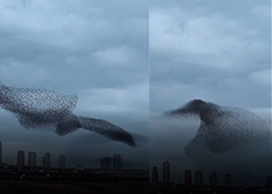 El fotógrafo turco Emre Ozden logró captar la magnífica danza de una bandada de estorninos bajo el cielo de Ankara. En las imágenes se ve a las aves formando una nube ondulante que se mueve de forma armónica, provocando una escena fascinante. Estas grandes acumulaciones de estorninos, donde puede haber hasta decenas de miles, les brindan múltiples beneficios, como facilitar la búsqueda de alimento y despistar a los depredadores.