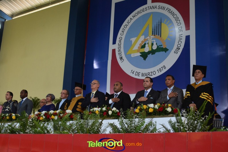 El acto inició con el desfile de los graduandos, dirigido por abanderados del cuerpo de bomberos de esta ciudad, donde posteriormente se procedió a la interpretación de las notas del himno nacional, a cargo de la banda municipal de música y del himno de la UCNE, a cargo del coro universitario.