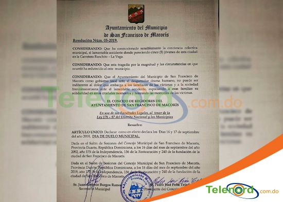 San Francisco De Macorís.- En sesión extraordinaria celebrada en la mañana del lunes 16 de septiembre, el Concejo de regidores del Ayuntamiento Municipal declaró dos días de duelo municipal, por el fallecimiento de cinco jóvenes.