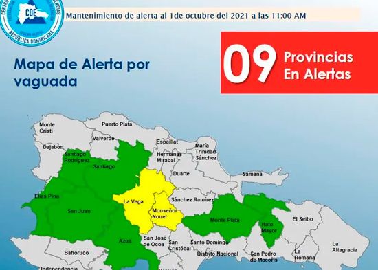 SANTO DOMINGO.- El Centro de Operaciones de Emergencias (COE) elevó a nueve las provincias en alertas ante posibles inundaciones, dos en amarilla y siete en verde.