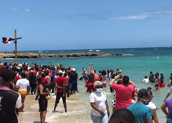 Desafiando las normas del distanciamiento social, que buscan disminuir los contagios por EL COVID-19, cientos de personas acompañaron al Peregrino de Villa Altagracia a llevar una cruz en la playa del malecón de esta ciudad, bajo un candente sol proclamando que a partir del lunes la enfermedad comenzará a desaparecer del país.