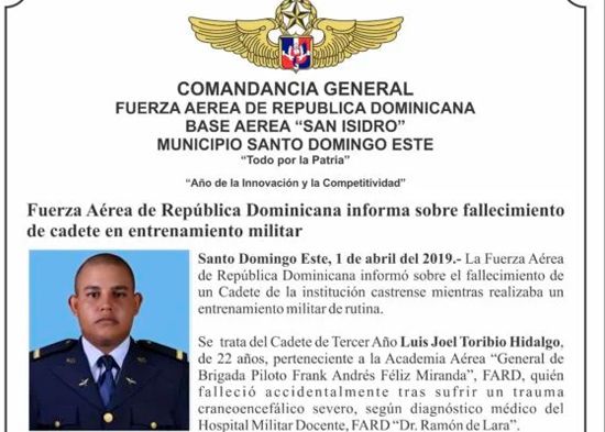 SANTO DOMINGO.- La Fuerza Aérea de República Dominicana (FARD) informó el fallecimiento de un cadete de la institución, mientras este realizaba un entrenamiento militar de rutina.