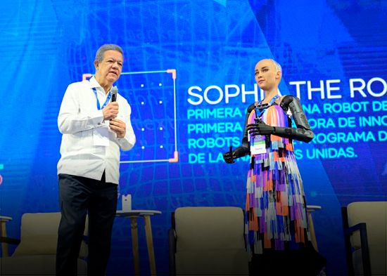 La robot humanoide Sophia visita República Dominicana en el marco del Foro Global @ Casa de Campo organizado por Funglode. Allí partició junto al presidente de Funglode y expresidente de la República en el foro «Inteligencia Artificial, ¿progreso o amenaza para la humanidad?» que analizó los grandes avances, riesgos y problemas que genera el uso de la inteligencia artificial (IA) en el siglo XXI.