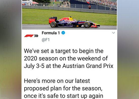 La Fórmula 1 ya ha anunciado oficialmente en sus redes sociales en comunicado de prensa su plan para el nuevo calendario del 2020. Las carreras comenzarán el fin de semana del 3 al 5 de julio con el Gran Premio de Austria en el Red Bull Ring. El siguiente circuito en recibir a la Fórmula 1 sería Silverstone, el 19 de julio, que es la siguiente fecha del calendario siempre y cuando las condiciones de seguridad y sanatoria sean las más adecuada..