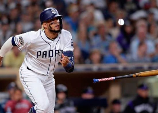 Fernando Tatis Jr. de San Diego Padres observa un batazo que resultó en un triple durante la octava entrada del juego contra los Rockies de Colorado, el sábado 10 de agosto de 2019, en San Diego. (AP / ORLANDO RAMIREZ)