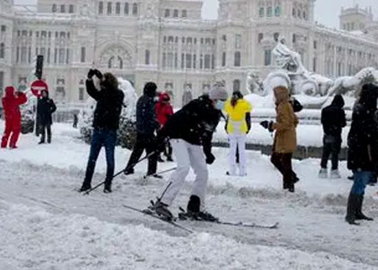 La nevada fuera de lo común también trajo imágenes insólitas para muchos madrileños. Algunos se atrevieron a salir a la calle con sus equipos de esquí y recorrieron la principal avenida comercial de Madrid, la Gran Vía, y la Puerta del Sol, y hubo hasta un trineo tirado por perros, según videos que circulaban por redes sociales.