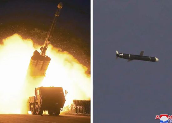 Los medios de comunicación estatales norcoreanos publicaron fotografías de un cohete disparado desde un camión de lanzamiento y de lo que parecía un misil con alas y aletas caudales desplazándose por el aire.