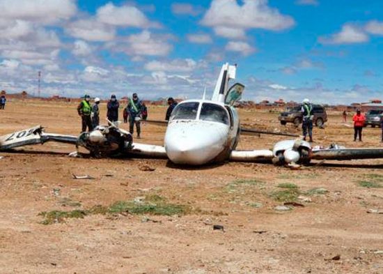 Algunas imágenes difundidas por medios locales y redes sociales muestran a la avioneta Cessna C-402 con matrícula CP-2807 en medio de una explanada en las afueras de la ciudad altiplánica con daños en el tren de aterrizaje y también en los dos motores.