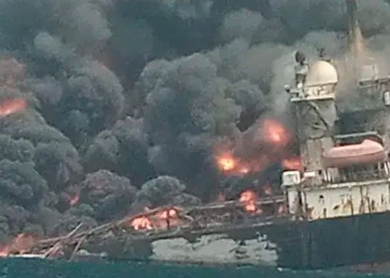 En vídeos compartidos en redes sociales, se puede ver una inmensa humareda negra y grandes llamas elevarse desde la plataforma parcialmente hundida en el mar.