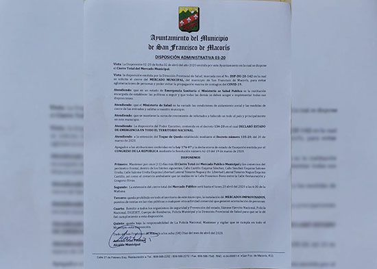 Según la disposición administrativa 03-20 emitida por el alcalde Alex Diaz, la extensión del cierre del mercado se enmarca dentro de la Disposición del Ministerio de Salud Pública, par evitar la propagación del Coronavirus en el municipio.