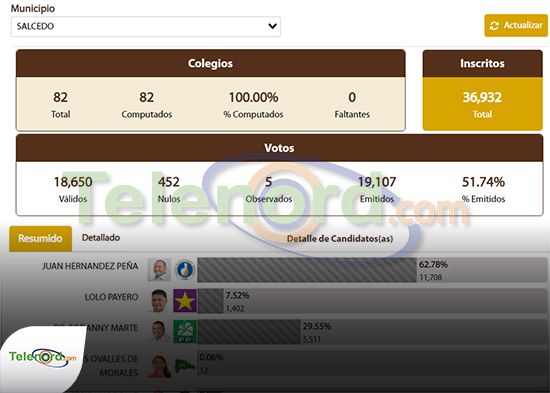 En el municipio de Salcedo, Juan Hernández Peña del Partido Revolucionario Moderno (PRM) alcanzó 11,708 votos para un 62,78%; Edoanny Marte de la Fuerza del Pueblo (FP) con 5,511 votos para un 29,55%; Lolo Payero del partido de la Liberación Dominicana (PLD) 1,402 votos para un 7,52%.