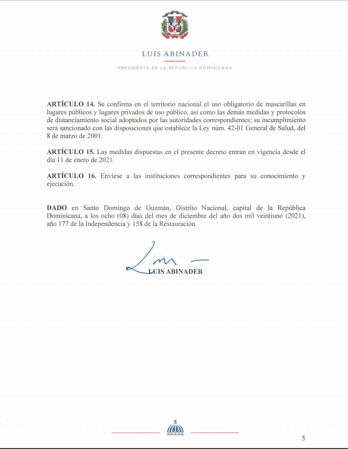 Con el decreto 7-21, el presidente de la República, Luis Abinader, informó la nueva fecha del toque de queda que regirá en el país y las nuevas normas con las cuales busca atenuar los contagios por COVID-19.