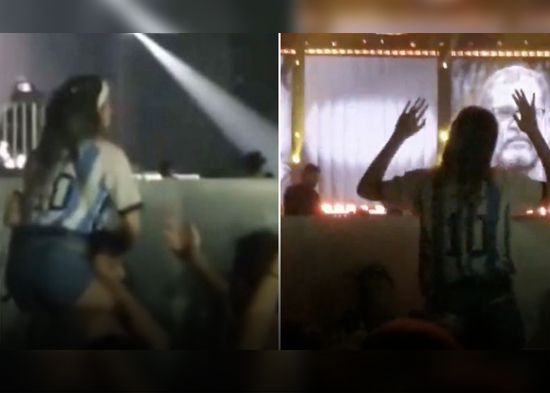 Luciendo el dorsal 10 de Lionel Messi, la joven, que estaba en primera fila, se subió a los hombros de su acompañante para tener una mejor vista. Sin embargo, eso incomodó a algunas personas detrás suyo, a quienes parecía impedir ver lo que ocurría sobre el escenario.